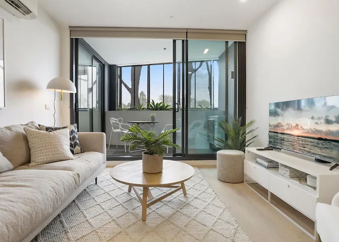 Chic 2-Bed Apartment With Undercover Parking 墨尔本设有设施齐全的厨房和配相邻露台,咖啡机/煮茶机 和电视的客房. 住宿场所距离墨尔本板球场有7公里,它距离维多利亚公园体育馆不到4.3公里.